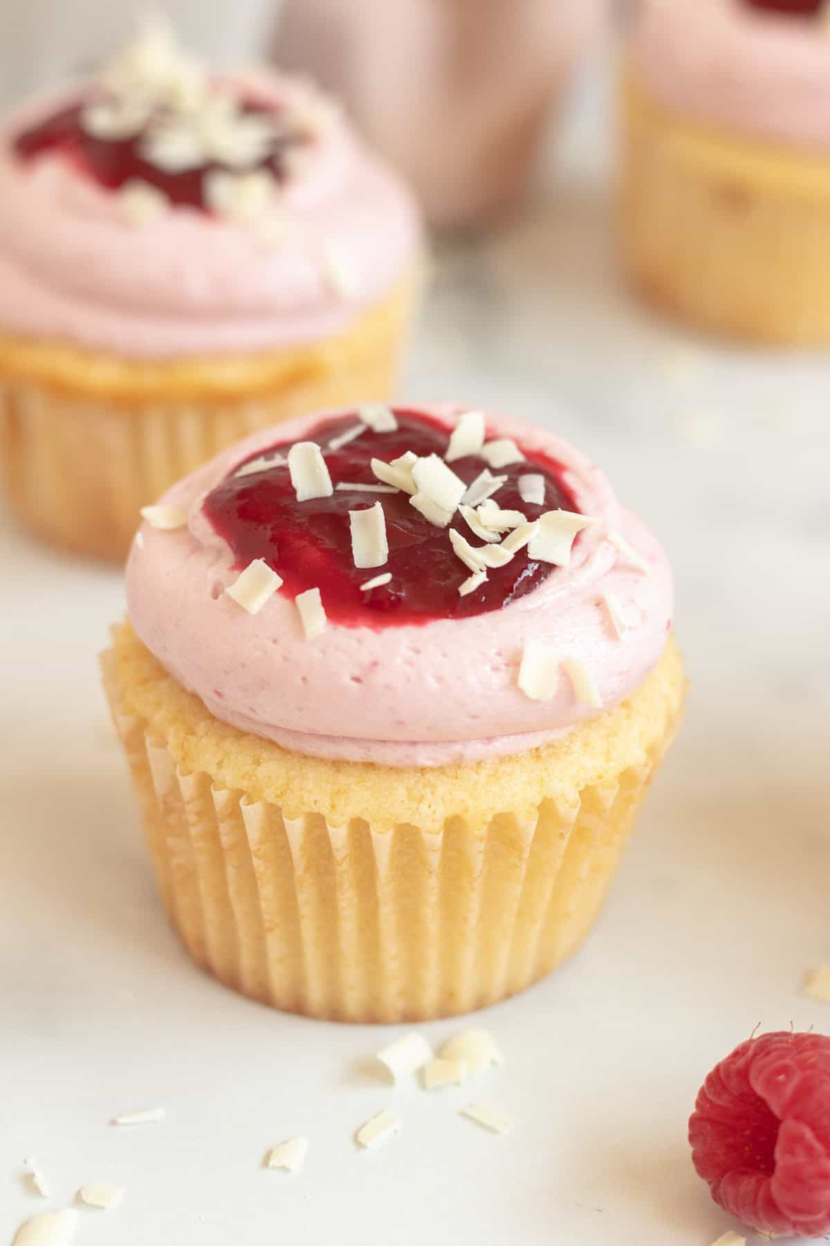 - Once completely cool, frost the cupcakes with the white chocolate raspberry buttercream. Use a spoon to make an indent in the buttercream and then spoon a dollop of raspberry sauce on top. Add white chocolate curls if desired.